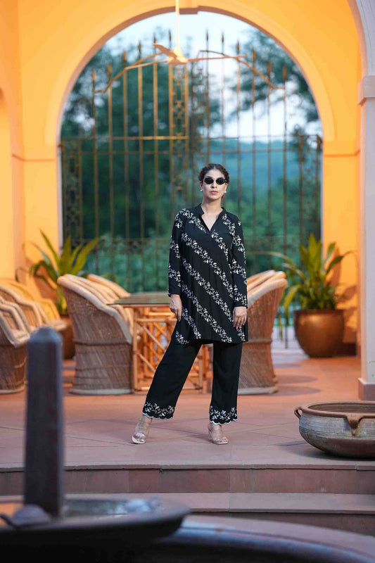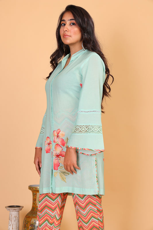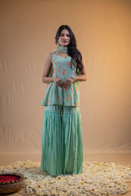 A-Line Cotton Georgette Kurta with Subtle Digital Print, Mirror Work, Matching Dupatta, and Coordinated Garara