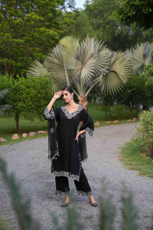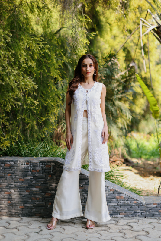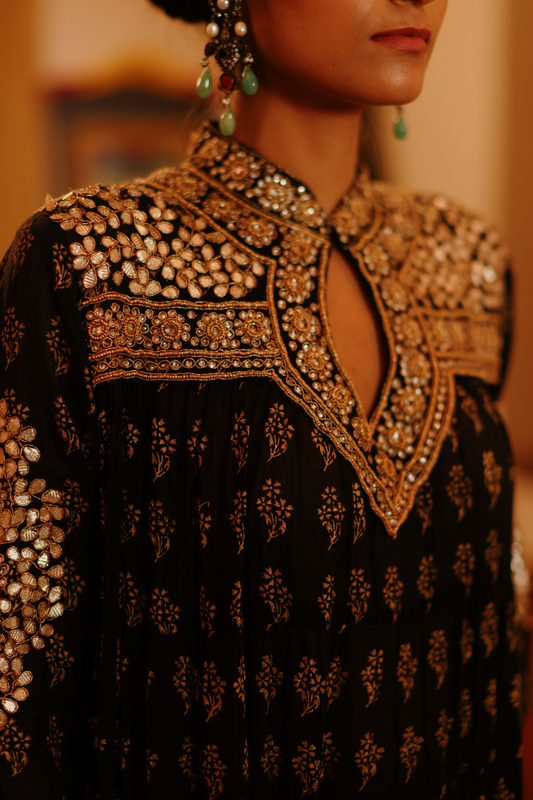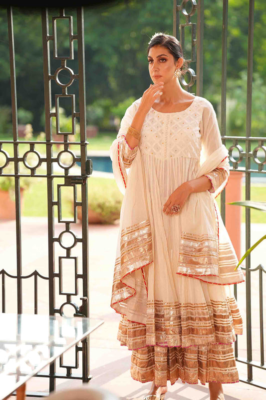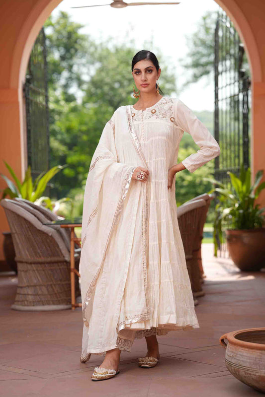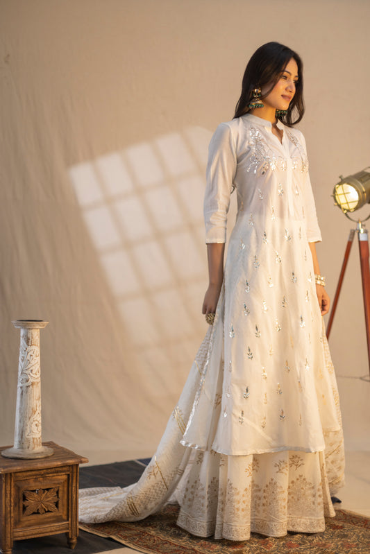 A-Line Kurta with Mukaish (Kamdani) Work, Khari Printed Skirt, and Matching Dupatta