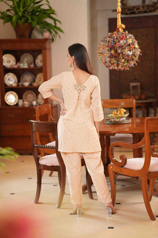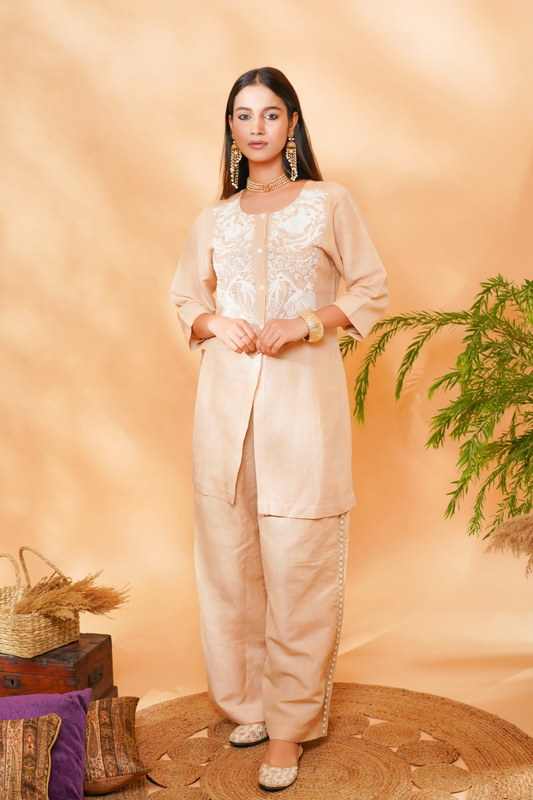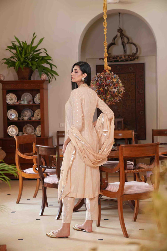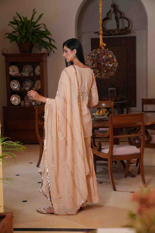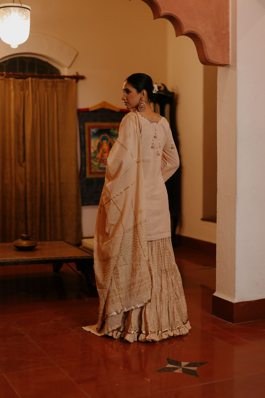 Beige kurta with delicate embroideries and printed skirt and dupatta