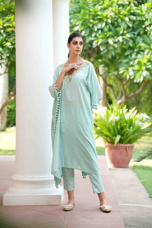 Sea green kaftan with hand embroidery neckline