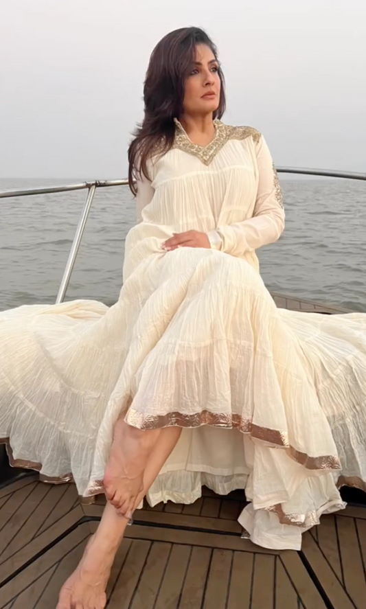 Raveena Tandon's Crushed ivory set with neckline embroidery
