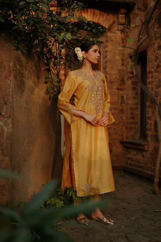 Chanderi yellow ochre kurta with embroidered neckline