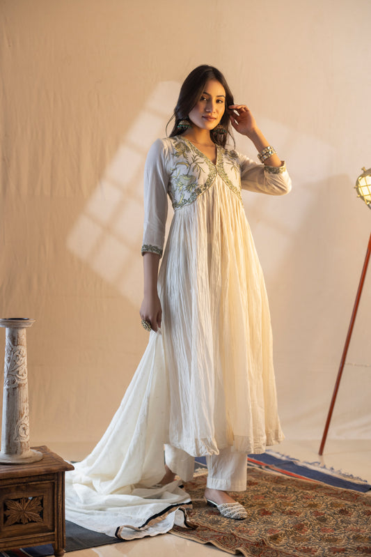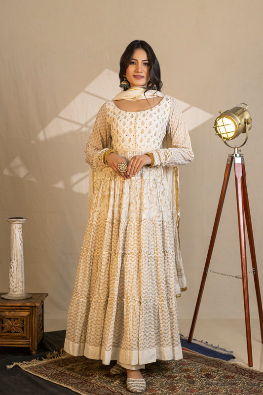 A-Line Kurta with Mukaish (Kamdani) Work, Khari Printed Skirt, and Matching Dupatta