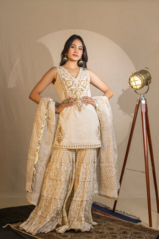 Foil-Printed Kurta with Bead & Aari Work, Garara, and Block-Printed Dupatta
