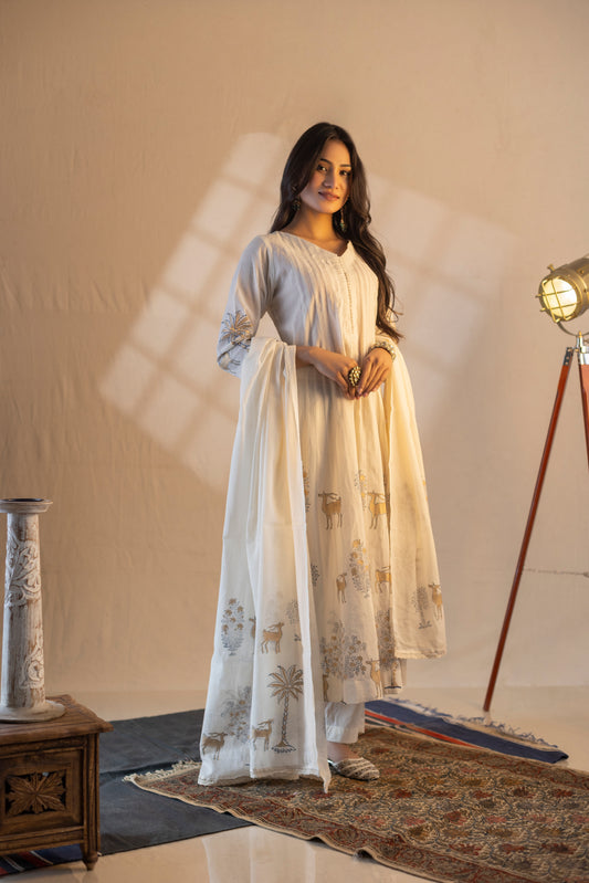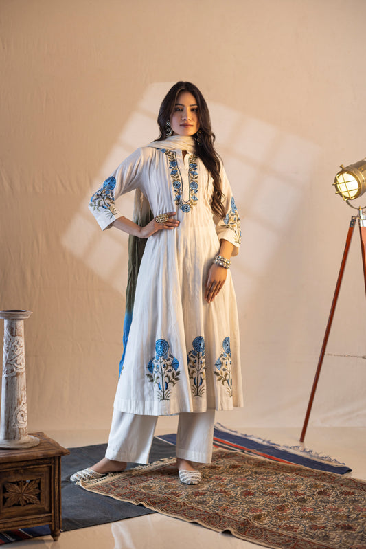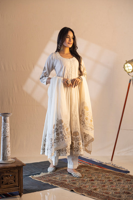 Lucknowi Daraz Yoke with Khari Block Print, Dupatta & Churidar