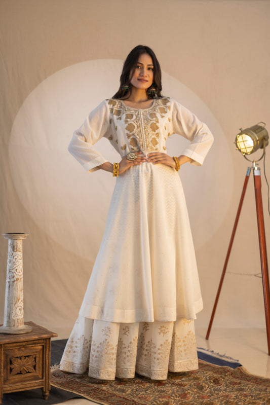 Hand-Embroidered Kurta with Aari & Sequin, Kalidar Skirt, and Gold Block-Printed Dupatta with Garara