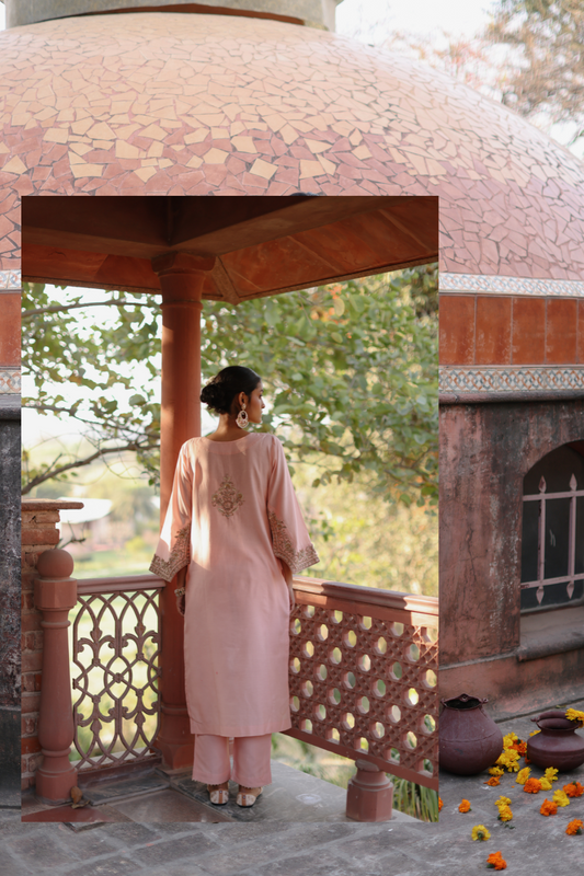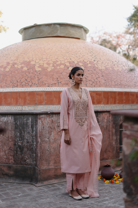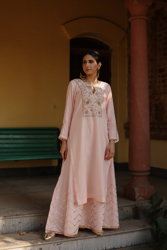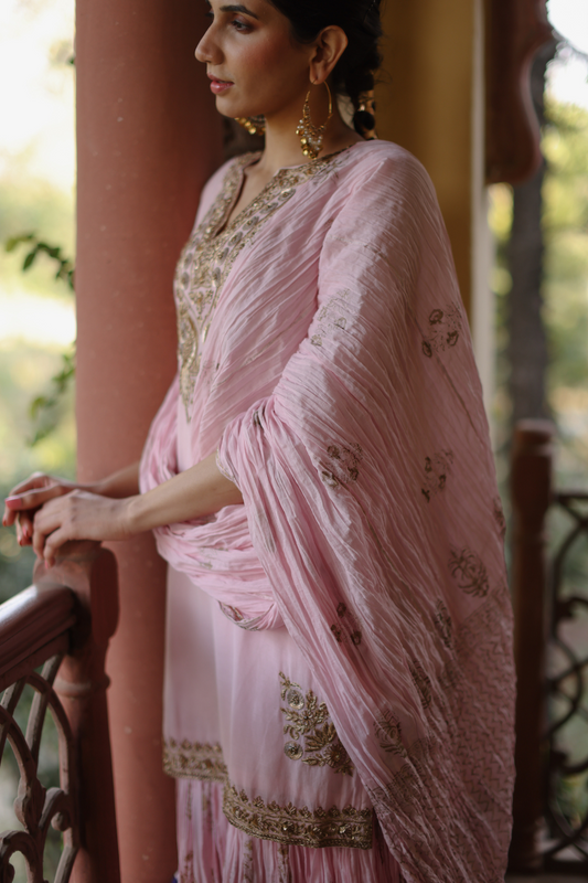 Pink kurta with crushed khadi printed pallazo and dupatta