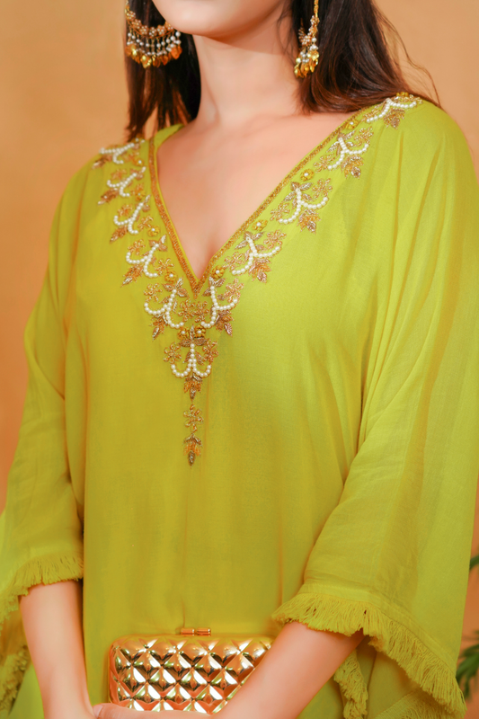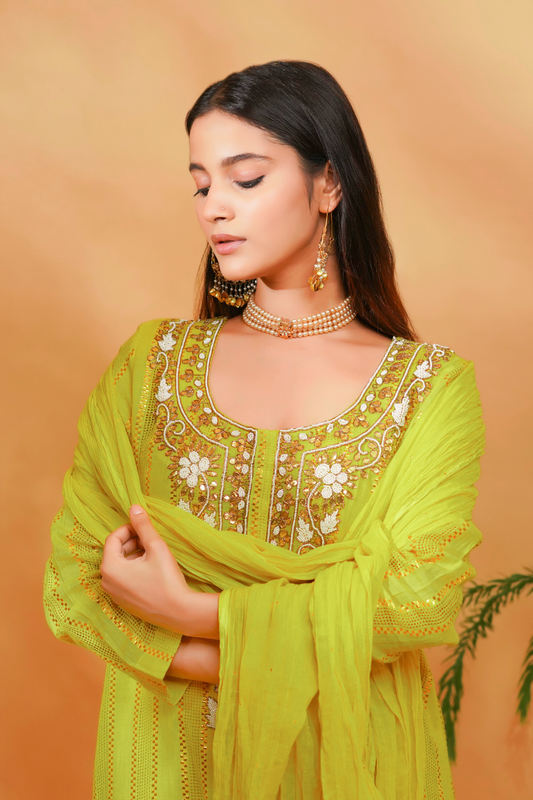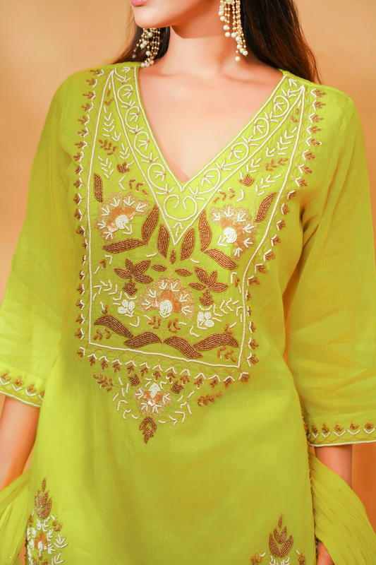 Lime kurta with floral embroidered yoke paired with sequins garara