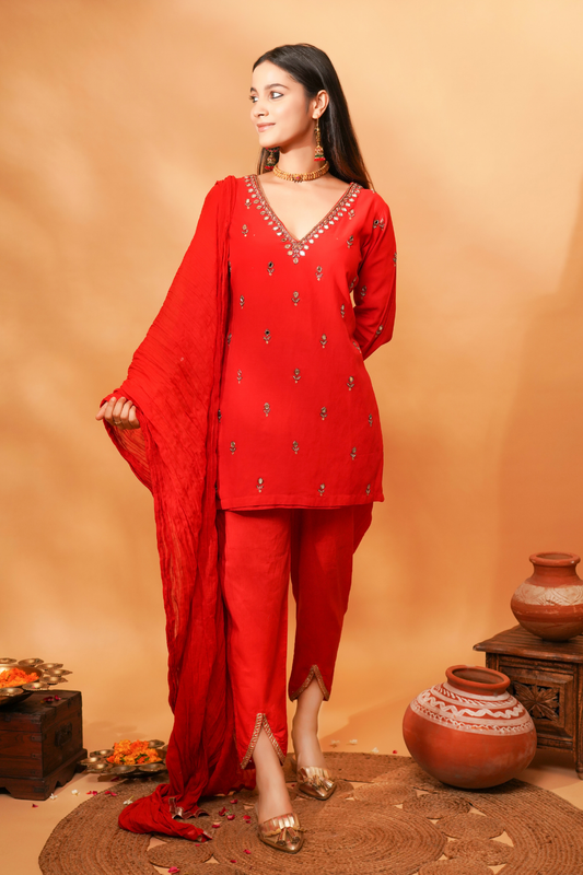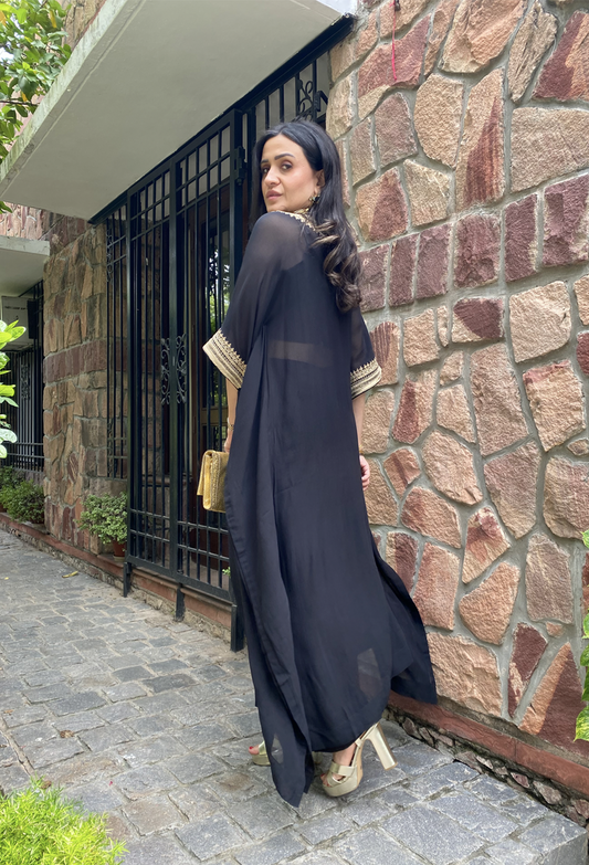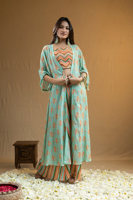 Floral Halter Neck with Shell Edging, Paired with Plain Flared Pants and Chevron Print Cape with Mirror Work Lace