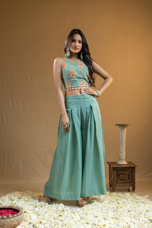 Halter Neck Top with Shell Edging, Paired with Flared Palazzo